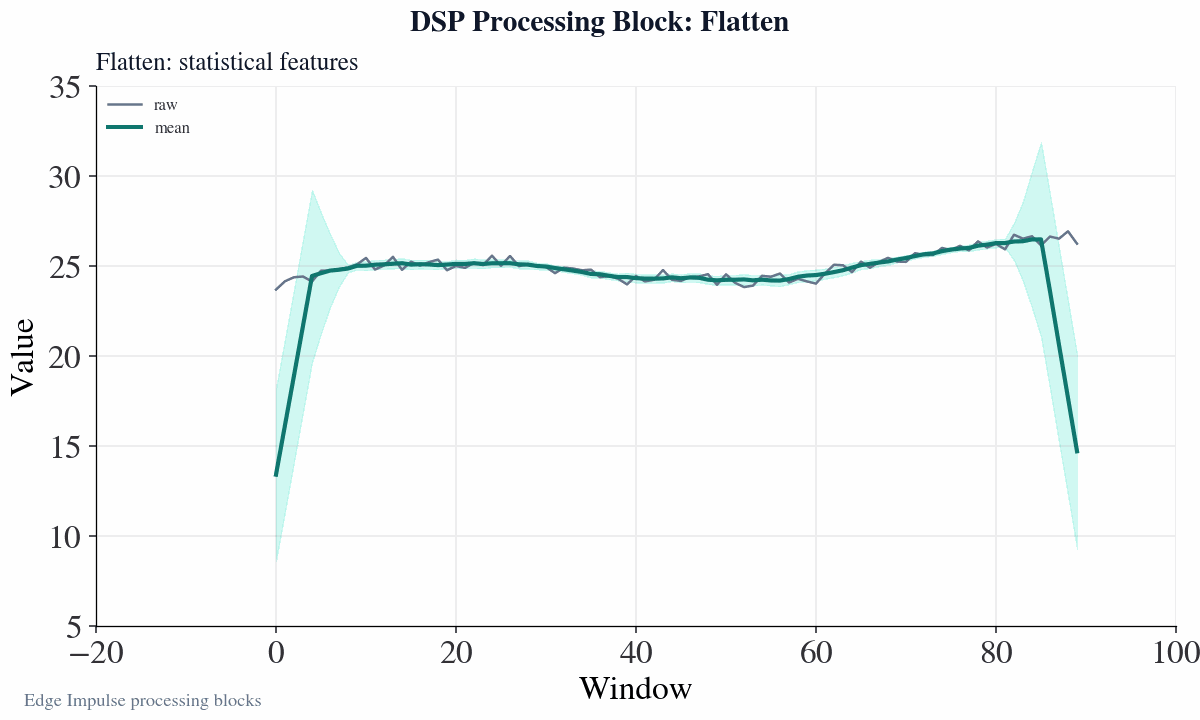 - Moving Average Number of Windows: Calculates the moving average by maintaining a rolling average of the last N windows. Note, there is no zero padding, the block will accumulate averages up to N windows. (Ex. for the first window in a sample, the moving average will equal the average). The moving average resets for each sample during training, and during inference, when run_classifier_init() is called. Note if you enable this, you probably don’t want overlapping windows for training.